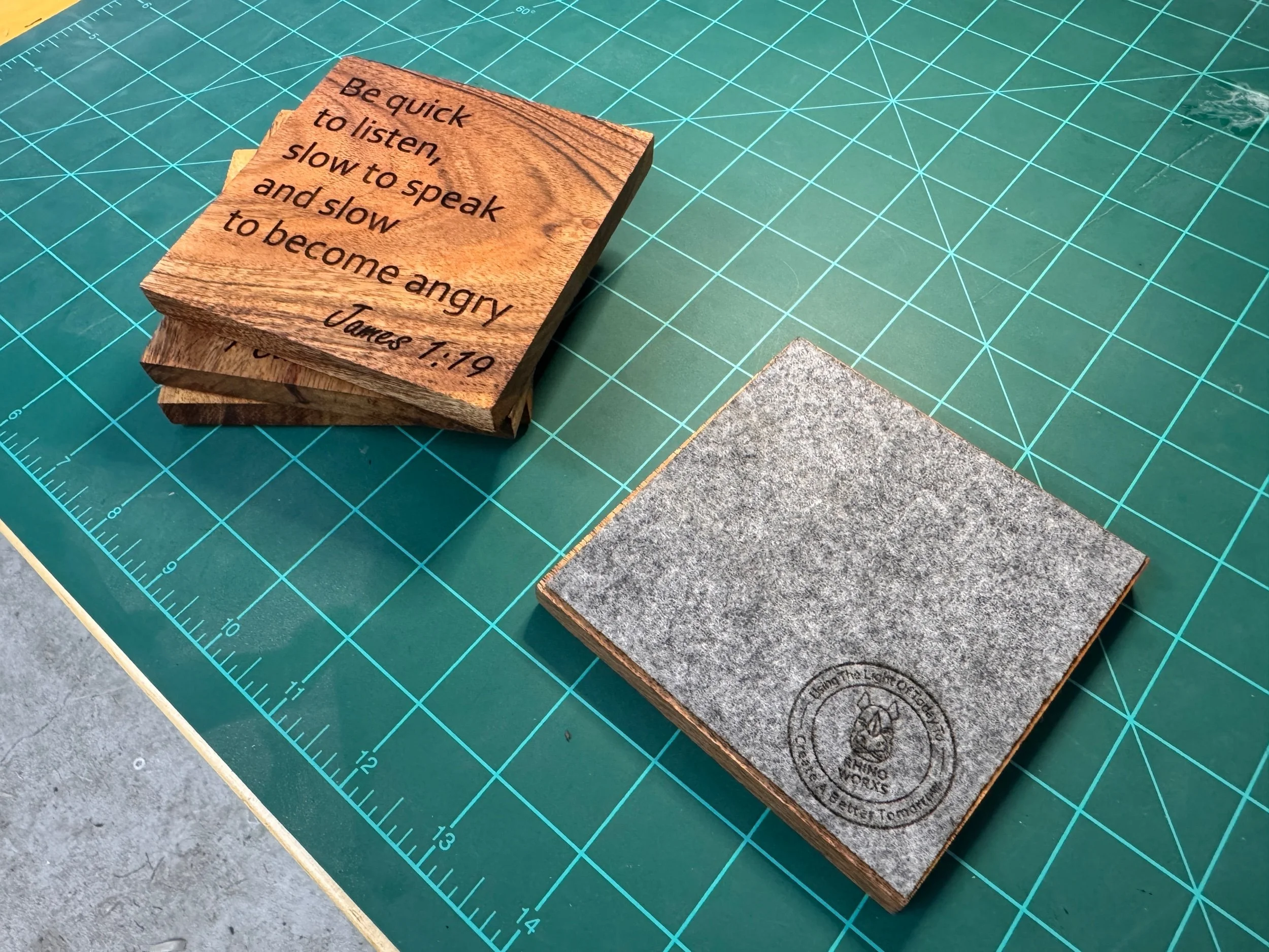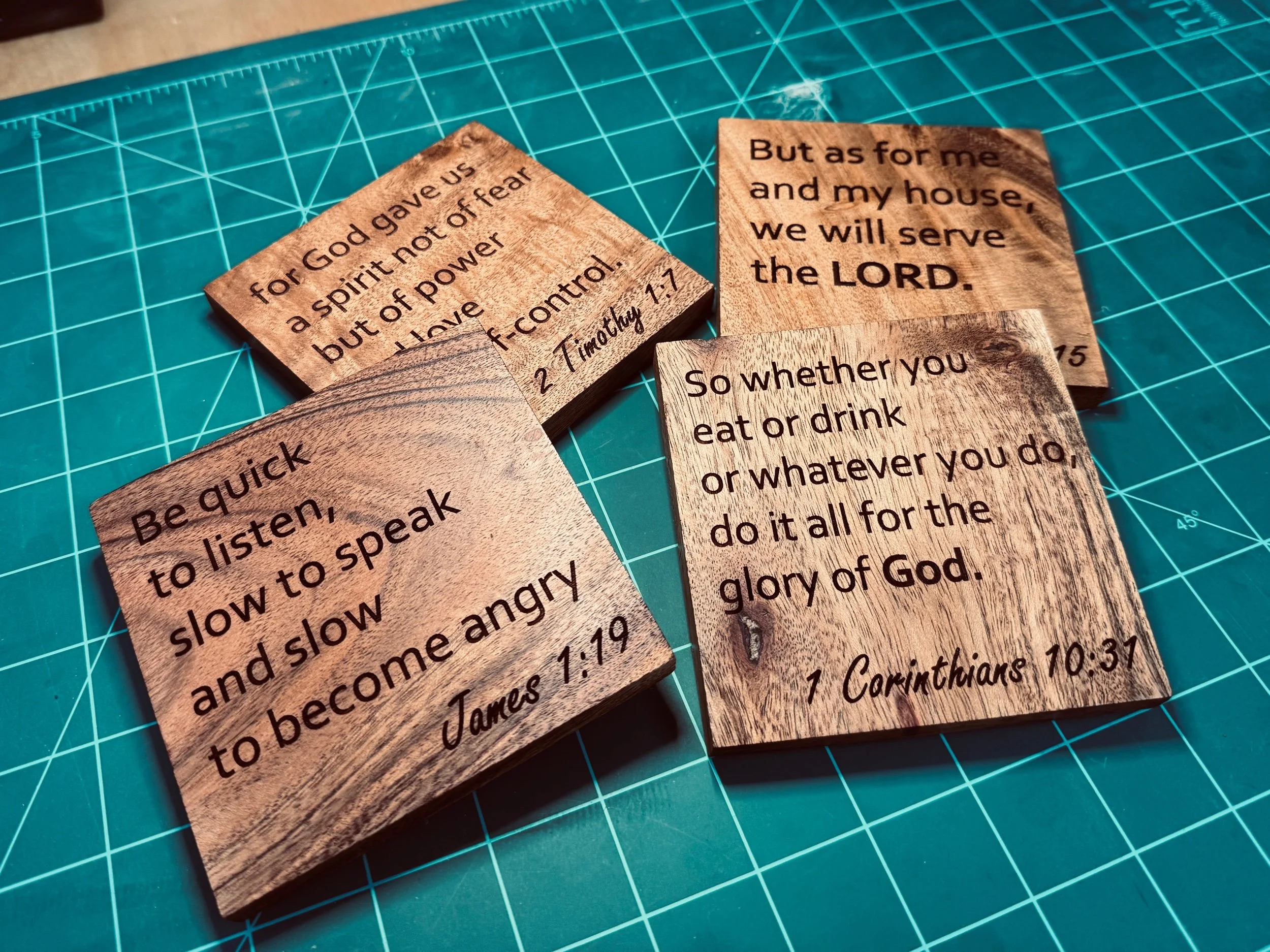 These wooden coasters are engraved with verses that hit home for our family. Daily reminders of what is really important in life. We add in a nice felt bottom to keep the underlying surface damage free.